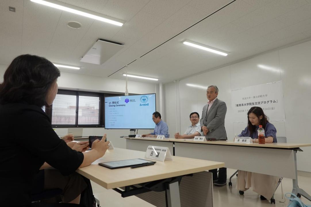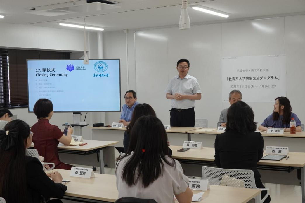 7月14日下午研修闭幕式上,人间学系滨田博文教授代表学校致辞,他热情地转达了每一位任课教师对东北师大学子的高度评价,指出本次交流对日本师生来说也是一次非常难得的学习机会。他提到,大家是从中国各地的教育一线来到筑波的,希望今后在研究和实践中也都能活用今日所学,他也期待着东北师大与筑波大学之间即将展开更多的学术交流。