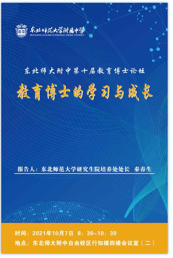 2021年10月7日,东北师大附中第十届教育博士论坛如期举行。本届论坛的主题是“教育博士的学习与成长”。论坛特邀东北师范大学研究生院副院长秦春生教授做主旨讲座,32位教育博士参与本次论坛。